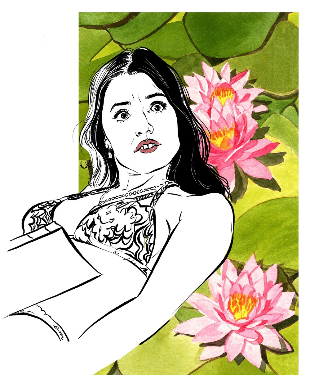 Perhaps one of the purest souls to ever grace our screens, we have the sweet Chelsea is immortalized from season 3 of The White Lotus, illustrated by me and background watercolor by my friend and artist/painter Suzy Kopf of Suzy Kopf Studio suzykopf.com
